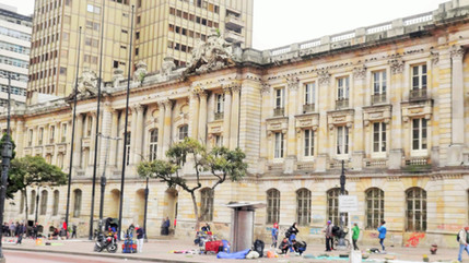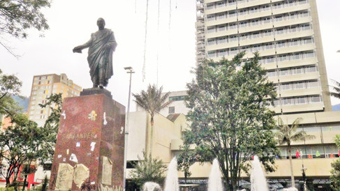 Önünde Santander Parkı var. Gelip geçenlerin yanı sıra sokak satıcılarının olduğu biraz güvensiz kirli ve idrar kokan bir park. Parkın bir kenarındaki havuzda atletik vücutlu bir Kolombiyalı pantalonla sabah banyosunu yapıyordu. Parkın ortasında, İtalyan sanatçı Prieto Costa tarafından yapılan 1890'da açılan Francisco de Paula Santander'in [1] bronz bir heykeli vardı. Ancak kaidesine bir sürü ilan yapıştırılmıştı.