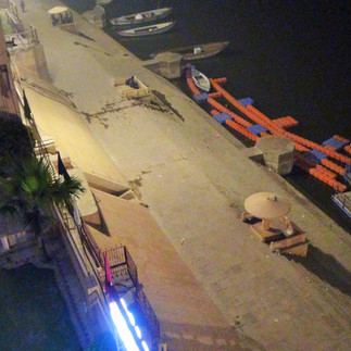Uçaktan sonra şehrin merkezine araçla gittik. Ancak otele kadar valizleri çekerek taşıdık. Varanasi’nin gece trafiği, kalabalığı, korna sesleri, karanlık beni rahatsız etti. Neyse sonunda Ganj’a tepeden bakan otelimiz Alka Otel’e ulaştık. U şeklinde apartmandan bozma otelin ortasında bahçesi var. Aşağıda Ganj kıyısında insanlar, kayıklar, kıyıya inen merdivenler gözüküyor. Bütün grubun yorulması ile aynı bende yorgunluktan ne yemek yediğimizi bile kayda almamışım. Hemen odaya çıkıp yatıp uyuduk.
