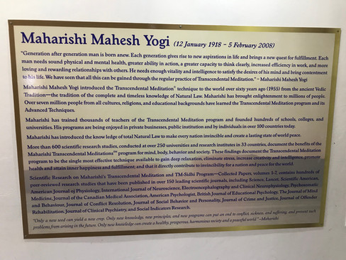 Beatles'ın kalışı: Beatles'ın Hindistan'da Transandantal Meditasyon eğitimi alma kararı, aşrama ve Rishikesh'e uluslararası ün kazandırdı. Grup ve maiyetleri oraya iki ayrı grup halinde seyahat etti. George Harrison ve John Lennon, eşleri Pattie Boyd ve Cynthia Lennon ve Boyd'un kız kardeşi Jenny ile birlikte 16 Şubat 1968'de Delhi'ye vardılar. Daha sonra taksiyle 240 km yol kat ederek Rishikesh'e gittiler. Varışlarını hatırlayan Harrison şunları söyledi: "Rishikesh, Ganj'ın Himalayalar'dan dağlar ve Delhi arasındaki ovalara aktığı yerde bulunan inanılmaz bir yer. Himalayalar'dan oldukça büyük bir su akışı var ve nehri büyük bir asma köprüden [Lakshman Jhula] geçmek zorunda kaldık." Beatles'ı, çoğunlukla çitle çevrili ve kapılı yerleşkeden uzak tutulan bir muhabir ve fotoğrafçı heyeti takip etti. İskoç şarkıcı-söz yazarı Donovan , Beatles'tan kısa bir süre sonra geldi ve Mia Farrow , Beach Boys'dan Mike Love ve caz flütçüsü Paul Horn düzinelerce diğer meditasyon yapanlar arasındaydı, hepsi Avrupalı veya Amerikalıydı. Beatles'ın arkadaşlarından biri olan elektronik mühendisi ve mucit Alexis "Magic Alex" Mardas , Maharishi'nin mesajını yayınlamak için aşrama yüksek güçlü bir radyo vericisi sağlama umuduyla Rishikesh'e çağrıldı. Beatles'a tahsis edilen bungalovlar elektrikli ısıtıcılar, akan su, tuvaletler ve İngiliz tarzı mobilyalarla donatılmıştı. Batılı ünlülere bakmakla görevli Amerikalı bir dindar olan Nancy Cooke de Herrera'ya göre Maharishi, Beatles'ın odalarında aynalar, duvardan duvara halılar, duvar kaplamaları, köpük şilteler ve yatak örtüleri olsun diye yakındaki bir köyden birçok "özel eşya" temin etti. Ringo Starr daha sonra aşramı "bir tür manevi Butlins ", düşük maliyetli bir İngiliz tatil kampı ile karşılaştırdı. Beatles yerel kıyafetleri benimsedi ve aşramda öğrenciler için kıyafet dikmek üzere bir terzi vardı. Grubun üyeleri yerel kasabalardan alışveriş yaptı ve kendileri için sariler ve erkekler için gömlek ve ceket yapılacak kumaşlar satın aldı. Bu kasabalar arasında, Çin'in Tibet'e tecavüzü sonucu anavatanlarından sürülen Tibetlilerin pazarlarının bulunduğu Dehradun ve Mussoorie de vardı. Delhi'den teslim edilmek üzere birkaç Hint enstrümanı sipariş eden Harrison , bungalovlardan birini müzik odası olarak kullandı. Tüm öğrencileri katılmaya davet etti ve binanın çatısında müzik buluşmaları düzenlendi. Aşramdaki kalış, Beatles'ın şarkı yazma konusunda en yaratıcı dönemi oldu. Yeni şarkılarının çoğu doğadan ilham aldı ve çevrenin sadeliğini yansıttı. Lennon ve Paul McCartney'nin inziva sırasında özellikle üretken olmaları nedeniyle şarkılar daha sonra grubun "Beyaz Albüm" olarak da bilinen 1968 tarihli çift albümü The Beatles'ın büyük kısmını oluşturdu. 2021 tarihli The Beatles and India belgeselinde, TM hayranı Nick Nugent, grubun Ocak 1969'da Apple Corps binasının tepesinde verecekleri meşhur konseri beklerken, aşramda bir çatı konseri verdiğini hatırlıyor. Harrison ve Lennon, Beatles'ın meditasyona en bağlı üyeleriydi ve grubun aşramdan ayrılan son üyeleriydi. 12 Nisan'da, Maharishi'nin bazı kadın öğrencilerle uygunsuz davranışlarda bulunduğuna dair söylentiler ve iki grup üyesinin Beatles'ın şöhretinden faydalandığı yönündeki endişeleri nedeniyle Maharishi'ye yönelik bir suçlama atmosferinin ortasında ayrıldılar. Daha sonra Maharishi'yi reddetmelerine rağmen, Beatles'ın aşramdaki kalışı Transandantal Meditasyon'a geniş bir ilgi yarattı ve bu da Batı popüler kültüründe Doğu maneviyatının incelenmesini teşvik etti. Harrison'ın 1991'deki kişisel özür dilemesinin ardından, itibarına yapılan hakaretler nedeniyle Beatles'ı affedip affetmediği sorulduğunda Maharishi, "Meleklere asla kızamam," cevabını verdi.