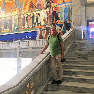 Biz gezmeye Nobel Barış Ödülünün verildiği büyük merkez salondan başladık. Zengin dekorasyonu ve büyüklüğü ile etkileyici bir salon. 31 m. genişliğinde, 39 m. uzunluğunda ve yaklaşık 21 m. yüksekliğinde. Yaklaşık beş metre yukarıda, üç tarafa uzanan bir balkon var. Balkon korkuluğu, alt duvarlar ve zemin Norveç mermeri ile kaplanmış. Salona girdiğinizde sizi ilk karşılayan Henrik Sørensen'in muazzam yağlı boya tablosu. ”Yönetim ve Şenlik" başlıklı duvar resmi, Norveç tarihi ve efsanelerinden sahneleri tasvir ediyor. Sanatçı bu duvar resimlerini 1938 ve 1950 yılları arasında yapmış. Sosyal reformlar, eğitim, sosyal mücadeleler, savaş yılları ve Norveç Kraliyet tarihi hakkında ki hikayeleri anlatıyor. Birçok önde gelen Norveçliyi değil, aynı zamanda günlük hayatlarını sürdüren sıradan insanları da tasvir ediyor. Arkada sanatçı Alf Rolfsen tarafından yapılmış başka bir fresk var. Bu, 40'lı ve 50'li yıllarda Norveç'in ana ticaretini gösteren “Ulusun Resmi”. Bir balıkçı, bir çiftçi, bir denizci ve bir sanayi işçisi. Freskin sol tarafında kutup gezgini Fridtjof Nansen'i görebilirsiniz, o dışa dönük Ulus'u temsil ediyor. Diğer tarafta ise içsel ruhsal yolculuğu temsil eden yazar Bjørnstjerne Bjørnson var. Sol altta Alf Rolfsen'in İşgal Frizi adlı başka bir fresk, Norveç'in Nazi kuvvetleri tarafından işgal edildiği 1940-45 zorlu savaş yıllarından sahneleri betimliyor. Üst katlara salonun sağından uzun ve geniş bir mermer merdivenden çıkılıyor. Merdivenin duvarında ise Oslo şehrinin koruyucu azizi olan Saint Hallvard freski var.
