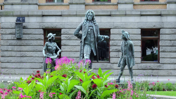 Belediye binasının önünde Emil Lie ve Per Hurum'un kadın ve çocuk heykellerinin bulunduğu "Synken" heykel parkı var. Per Hurum’un karşılıklı iki çeşme grubu, "Anne ve çocuklar", oturan kadın ve çocuk heykelleriyle (1941-44) alanın sağına ve soluna, Emil Lie'nin granitten dört oturan kadın figürü (1954-1958) ise sahanın köşelerine yerleştirilmiş. Ortada ise sırtları birbirine dönük el ele tutuşan iki kadın figürü ve iki çocuktan oluşan uzun granit bloğu ile merkezi çeşme ise 1960 yılında tamamlanmış. Denize daha yakın solda ise 1901 yılında heykeltraş Axel Ender tarafından yapılan büyük İskandinav Savaşı sırasında Danimarka-Norveç donanmasında görev yapan kahraman deniz subayı Peter Wessel Tordenskiold’un heykeli var.