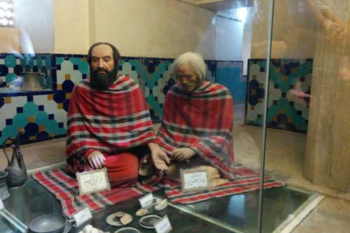 Hamamın içinde duvarlar belimize kadar mavi çini ile kaplı. Hamamın içinde Amir Kabir, hamamcı ve cellatların heykellerinin olduğu Amir Kabir’in [8] öldürülmesinin canlandırıldığı geniş bir alana sonra yine bir sürü koridor geçip Amir Kabir’in şehit edildiği yer yazan küçük bir küvetin olduğu alana geliniyor. Koridordan devam edince de bizim soğukluk dediğimiz alanlara geçiliyor. Sonrada diğer hamamdan dışarı çıkılıyor. Fin bahçesinden çıktığımızda kalabalık meydanda yeşil renkli belediye otobüsleri ile dış görünüşü bir kaleyi andıran üstü açık bir turist otobüsü vardı.