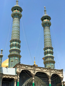 Önce büyük bir avluya girdik. Buradan Fatıma-ı Masume’nin [5] türbesinin üzerindeki altın kubbe gözüküyor. İmam ve İmamzade olmadığı halde naaşı için altın kubbeli türbe yapılan tek kadın Hz. Fatımâ imiş. Erkekler için avluda havuzlu abdest çeşmeleri bulunuyor. Avluyu çevreleyen birkaç Taç kapı var ve heryeri özellikle mavi renkli mukarnasları çok güzel işlenmiş. Kimisinin üstünde iki minare var.