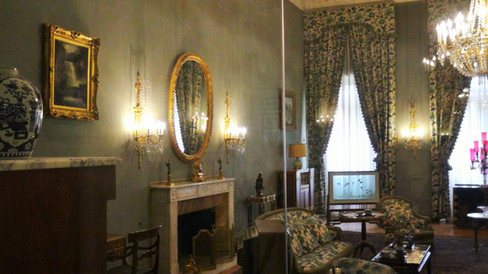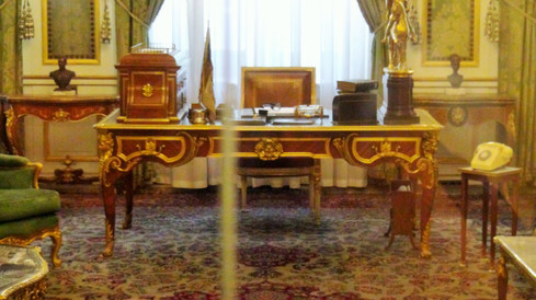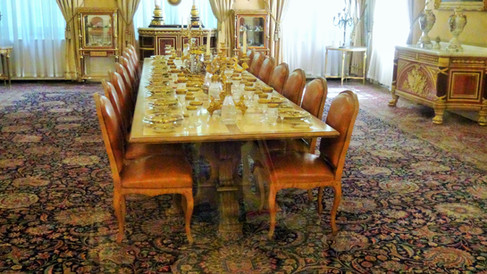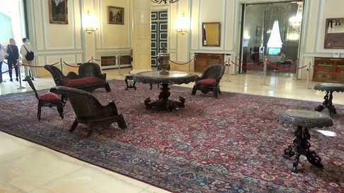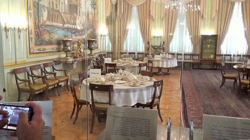 Oradan hızlıca ünlü Talar-e Ayeneh / Aynalı Salona bakıp, Talar-e Adj / Fildişi Salonuna geçtik burası yemek odası olarak kullanılıyormuş. Duvarlarda Muzaffereddin Şah, Nassereddin ve son Kaçar Şahı Ahmet Şah Kaçar’ın resimleri vardı. Birde ortadaki aynanın iki yanında iki büyük fildişi duruyordu.