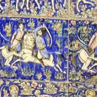 Ara holde insanın beline kadar ki bölümde o dönemki olayları savaşları askerleri hayvanları gösteren kabartma rölyef çiniler vardı.
