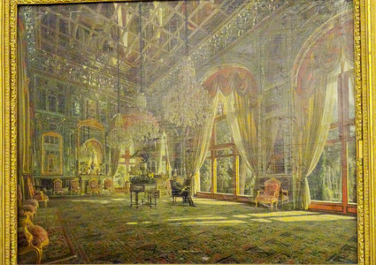 Buradan Ana Hole ve Talar-e Salam /Resepsiyon Selam Salonu alt giriş merdivenlerine geliyorsunuz, çevreniz, tavanlar tamamen şıkır şıkır ayna. Buradan sonra ayağınıza galoş giymek zorundasınız. Merdivenleri çıkarken duvarlar alçı ile iğne oyası gibi işlenmiş. Yukarı kata çıkıp salona giriyorsunuz. Bu salon Nassereddin Şahın Avrupa’ya yaptığı seyahatler sonun da etkilendiği müze ve salonlar örnek alınarak yapılmış. Tavan ve duvarlar alçı sıva, zeminler ise mozaik kaplı. Ancak her yerde bu sıvalar üzerinde enfes iğne oyası gibi ayna işçiliği var. Sağdan başlayıp salonu dönerseniz duvarlarda içlerinde Kemal el-Mülk'ün [9] de bulunduğu İranlı ressamların nefis tabloları ve ayrıca bazı nefis objeler teşhir ediliyor.