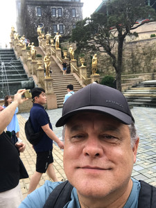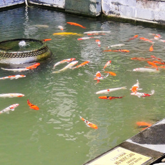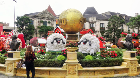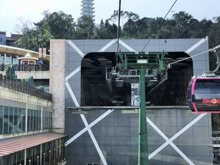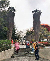 Çok süslü ana giriş kapısından sonra Uzakdoğu sarayları benzeri bir binaya doğru ilerleyip önündeki taş köprülerden birinden geçtik. Taş köprünün iki yanı mermer hayvan heykelleri ile süslü idi. Binaya girip yürüyen merdivenlerle yukarı çıktık. Yanlarında kırmızı Koi Japon balıkları ile dolu havuzlar ve dükkanlar olan üstü kapalı sundurmalardan geçip epey yürüdükten sonra teleferiğe binilen alana geldik.