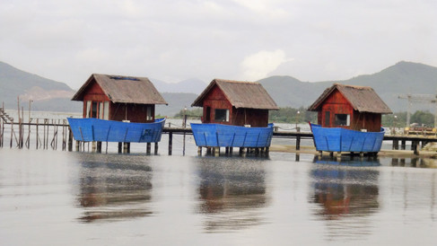 Yaklaşık 1 saat sonra Güney Çin denizine açılan Dam Cau Hai lagününe ulaştık. Hava bulutlu ve kapalı idi. Burada ufak bir mola verdik. Otobüsten inip sahile yürüdüm. Sanırım turistler için otel olarak düşünülmüş ağaç direkler üzerinde ahşaptan evler vardı. Yol kenarında büyük naylon torbalar içinde ayıklanmamış istiridyeler dizilmişti. Lagünün kıyısı temiz olmayan bir şekilde lagünden çıkarılıp kıyıya yığılmış istiridye topakları ile doluydu. İki adam topak olmuş istiridyelerin üstlerindeki çer çöpü temizleyip kabasını alıp plastik sepetlere topluyorlardı. Sahildeki kayıklarda istiridye ile doluydu. Adamın biri komik bir şekilde büyük bir leğen şeklinde yuvarlak plastik bir kayıkla kürek çekerek dolaşıyordu. Lagünün ortalarına doğru bir sürü istiridye çiftliği görülüyordu.