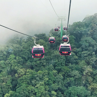 Buradan sırayla altışar kişi teleferiğe bindik. Yolculuk yaklaşık 15 dakika sürüyor. Yukarı çıkan üç farklı teleferik hattı var. Etraf yemyeşil orman, nehir ve şelaleler ile dolu.
