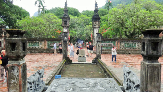 Sonra dışarı çıkıp yakındaki diğer tapınak olan Le Dai Hanh King Tapınağına [5] yürüdük. Burada da bizi bir tabela [6] karşılıyor. Diğer tapınak gibi buranında girişinde ejderha yatağı, dış giriş kapısı, sağda büyük bir havuz, iç giriş kapısı, solda eski devlet adamlarına tapınma, sağda Konfiçyus’a tapınma bölümleri, yine büyük bir ejderha yatağı ve tapınak binası görülebiliyor. Rehberin anlattığına göre bu kral önceki kralın öldürülmesinde parmağı olduğu şüphesi ve sonrasında da ilk kralın karısı ile evlendiği için halk tarafından tasvip edilmediğinden ejderha yatakları kabartmasız, mezarı da daha alçak tavanlı ve basık yapılmış. Kraliçe Duong Van Nga heykeli ilk eşi Kral Dinh'in tapınağına doğru dönük duruyor ölümünden sonra bile eski kocasının tapınağına baktığında hala utanç duymakta imiş.