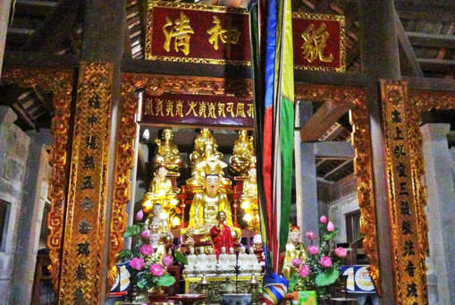 Sonra ana tapınak binasına giriliyor. Basamaklar çok yüksek ve içerisi çok karanlık. Tapınağın yapısı iki bölümden oluşuyor: ibadet salonu ve ana sunak. İbadet salonunda 17. yüzyıldan kalma, güzel oyulmuş bir tütsü masası bulunmakta. Kral Dinh Tien Hoang'un tahtı ana sunağın ortasında yer alıyor, kırmızı lake ve altın varakla dekore edilmiş.