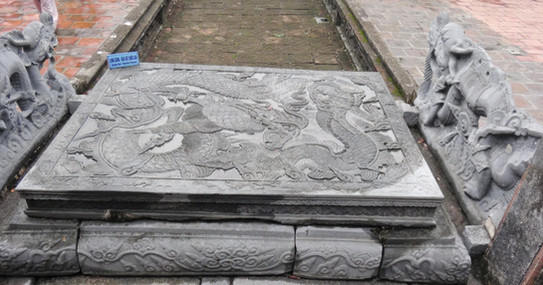 Yoldan devam edip iki büyük sütunu geçince tapınağın ana bahçesi olan ejderha bahçesine ulaşılıyor. Ejderha bahçesinin ortasında dört tarafında kısa sütunlar olan altı taş oymalarla kaplı yine taştan bir ejderha yatağı duruyor. Ejderha yatağının yüzeyinde güçlü ve görkemli bir ejderha kabartması var. Ejderha yatağının iki kol dayanağı, yüksek bulutların arasında kıvranan iki ejderha. İki figürün de başı dik, yelesi uçuşuyor ve önünden aşağı sarkan uzun bir sakalı var. Bu Dinh Hanedanın ünlü insanlarının bıraktığı değerli bir hediye olarak kabul edilip, aynı zamanda sanatsal yeteneklerini gösteriyormuş. Ayrıca Ejderha sunağının uzağında her iki yanda, yekpare yeşil taş bloğundan oyulmuş tek boynuzlu at figürleri de yer alıyor.