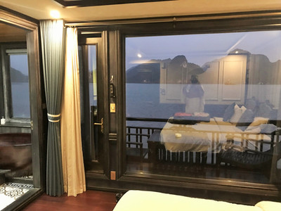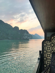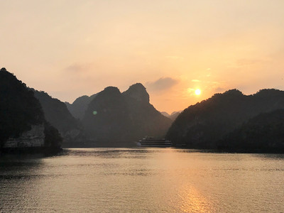 Uzaklarda Ha Long körfezini oluşturan 2000 adet kireç taşı adanın bir kısmı gözüküyor. Efsaneye göre Vietnamlılar denizden gelen yabancı istilacıların saldırısına uğrar. Bunu gören Yeşim İmparatoru, savaşta Vietnam halkına yardım etmesi için bir Ana Ejderha ve yavrularını gönderir. Düşman tekneleri sahile doğru ilerlerken ejderhalar yeryüzüne iner ve ateş püskürterek birçok düşman teknesini yakar ve püskürttükleri incilerden bazıları ise düşman teknelerinin çarparak parçalanmasına neden olan adacıkları oluşturur. Yol üzerinde sanırım cevher taşıyan büyük bir barçı ve onu iten römorkörü gördük. Denizin rengi zümrüt yeşili. Bunun nedeni nispeten sığ olmasından ve beyazımsı renkte bir deniz tabanına sahip olmasından kaynaklanıyormuş. Çevredeki yeşil doğa tabandan yansıyormuş.
