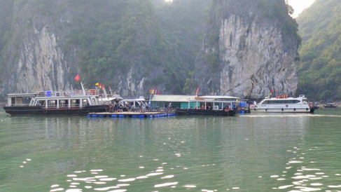 Tuần Châu adasının iskelesine ulaşıp diğer bazı tekne şirketleri gibi La Regina Grand Cruise şirketinin biniş saatini bekleyen yolcular için yaptırdığı özel salonda bekledik. İskeleye bağlı birçok tekne var. Buraya gezeceğimiz gemi yanaşamadığı için önce küçük bir tekneye binerek limandan çıkıyorsun. Valizlerimiz küçük teknelerden birine taşındı ve ana gemiye ulaşmak için hareket ettik. Çevrede bir sürü gezi teknesi var. Hava kapalı rüzgarlı ancak şükür yağmur yok. Denizde de inen ve kalkan deniz uçaklarını gördük.
