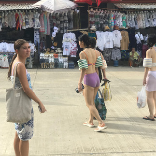 Yemek sonrası Kuangsi Şelalesine [17] gidebilmek için önce yukarıya çıkan araçların insanları aldığı market ve alışveriş yerlerinin olduğu bir alana geldik. Çevrede bizdeki mangal muhabbeti gibi şiş yerine bambu çubuklara sıkıştırılarak pişirilmiş muhtelif balık, tavuk, kaz, ördek, sosis ve domuz eti satılıyordu. Ayrıca atıştırmalık olarak küçük karidesler, çekirge ve muhtelif kurtçuk tabaklarda şirinklenmiş şekilde alıcılar sunuluyordu. İnsanlar da mayolarını ve kollarına yüzme kolluklarını giymiş dolaşıyorlardı. Bizde yanımıza mayomuzu aldık ancak benim hastalığım devam ettiği için şelalenin soğuk suyuna girmeye niyetim yok.