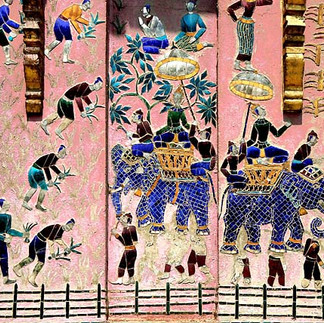 [7] Wat Xieng Thong At Arabası Evi : Araba Evi veya Kraliyet Cenaze Arabası Salonu (Hor Latsalat) Wat Xieng Thong'un doğu kenarında ve Thanon Sakkarine'den şehir girişinin sağında yer almaktadır. 1904-46 yılları arasında Luang Prabang Kralı ve 1946-59 yılları arasında Laos Kralı olan Kral Sisavang Vong'un (1885-1959) cenaze arabasını barındırmak ve korumak için inşa edilmiştir. Ayrıca diğer dini ve törensel kalıntıların yanı sıra zaman zaman kraliyet ailesine ait bazı tarihi Ramayana kuklalarını da barındırmaktadır. İnşaatına 1962 yılında başlanmıştır. Xieng Khuang (veya Luang Prabang III) tarzında çift çatılı nispeten uzun bir yapıdır. Binanın önünde tek bir giriş kapısı vardır, ancak cephe pencereleri giriş kapısıyla aynı boyutta ve şekildedir. Binanın iskeleti betonarmedir. Bu malzeme yalnızca iç kısımda görülebilmektedir. Benzersiz bir şekilde, dış cephe ve dış yan duvarlar yontulmuş ve yaldızlı tik ağacı panellerle kaplanmıştır. Bu paneller, yerel zanaatkâr Thit Tanh (Pae Ton) tarafından, Kraliyet Sarayı'nın usta zanaatkârlarının gözetimi altında diğer Luang Prabang zanaatkârlarının yardımıyla hazırlanmıştır. Paneller Ramayana hikayesinin Lao versiyonu olan Pha Lak Pha Lam'ı anlatmaktadır. Rama, Hanuman, Sita'nın ateşle yargılanması, Ravana ve altın geyik formundaki Indra'nın bölümlerini takip edebilirsiniz. Sağ timpanum, akbaba kralı ile Sita'yı kaçıran Ravana arasındaki mücadelenin tasviriyle çarpıcıdır. Ravana'nın sayısız kolları birçok farklı silahı tutmaktadır. Binanın kuzeybatı tarafındaki oymalı ahşap kepenklerde Maymun Kral Hanuman'ın yanı sıra deva ve devis tasvirleri yer almaktadır. Dış cephenin oymalı ve yaldızlı yüzeyleri ve iki yan cephesi parlak güneşte parıldar ve yakındaki simin karmaşık renklerini, çizgilerini ve desenlerini iyi bir şekilde tamamlar. Yaklaşık 12 m. yüksekliğindeki yaldızlı ahşap kraliyet arabası, giriş kapısında altı tekerlekli bir kamyonun gövdesi üzerinde görkemli bir şekilde durmaktadır. Bu da Thit Tanh'ın (Pae Ton) eseridir. Cenaze arabası, Kral Sisavang Vong'un kalıntılarını Nisan 1961'de yakılmak üzere Wat That Luang yakınlarındaki alana taşımak için kullanılmıştır. Oldukça süslü olan cenaze arabasının ön kısmında açık çeneleri ve belirgin dişleri olan yedi naga, ortasında ise yaldızlı ve süslü sütunlarla desteklenen özenli kırmızı bir gölgelik yer almaktadır. Kralın babasının (önde) ve annesinin (arkada) kalıntılarını içeren üç süslü yaldızlı sanduka vardır; Sisavang Vong'un kalıntılarına gölgelik altında merkezi bir onur yeri verilmiştir. Kalıntılar cenin pozisyonunda dik olarak yerleştirilmiştir. Kral, kraliçe ve kraliyet kardeşinin külleri Wat That Luang'da bulunmaktadır. Yan duvarlar boyunca uzanan bir dizi cam dolapta Buda'nın ahşap çerçeveli resimleri ve farklı kalitelerde diğer dini objeler ile çeşitli eşyalar (tarihi ahşap kuklalar) bulunmaktadır. Salonun arka tarafında, üzerinde çok sayıda mozaik eserin yer aldığı vermillion duvarın yanına yerleştirilmiş çok sayıda Buda ve diğer dini resimler bulunmaktadır.