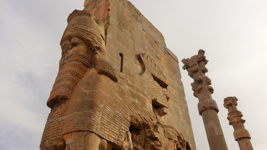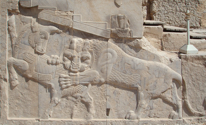 [15] Shahriar (Akamenid kralı) ve Aslan Savaşı : Kralın, kanatlı öküz, Griffin ve kanatlı aslan’la mücadelesini gösteren, Persepolis'in üç sarayındaki kaya oymalarını ifade eder. Özellikle 100 Sütunlu Saray'a, kralların yapıcı ve disiplinli olduklarını göstermek için yapılmışlar. Kapının her sütununa, her biri yapısal olarak aynı olan dört oyma işlenmiştir ve farklı varlıkların aksine Shahriar'ın figürü değişmemiştir. Shahriar sakin ve soğukkanlı bir şekilde rollerinin hepsinde canavarları öldürüyor. Kral olan kahraman bu resimlerde resmi taç yerine Pers şapkası ile görülmektedir. Şehriyar'ın sembolik hareketlerinden biri de ellerinin hareketidir ki bu görüntülerde bir eliyle canavarların başlarının ortasındaki boynuzlarını alıp diğer eliyle kalbe, yani canavarların organlarının iki önemli noktasına vurmaktadır. Ana salonun duvarlarındaki pandantiflerde tasvir edilen dört şeytan, onların iyilik tarafından yenilgiye uğratılmasını ve boyun eğdirilmesini temsil ediyor gibidir. Bu nedenle, yenilmiş şeytanların başları tavanların altında sütun başlığı olarak kullanılmıştır, bu da onların tuzağa düşürülmesine ve 'şeytanlara boyun eğdirildiğinde kurtuluş gelir' şeklinde dizginlenmesine bir ima gibidir." Ahamenişler iyi ve kötü güçlerin ikiliğine inanırlardı ve insanların refahı için düzeni bozan kötü güçlerle savaşmak Şehriyar'ın göreviydi.