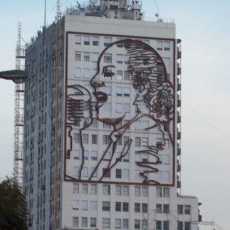 Havalimanını Buenos Aires'e bağlayan Pablo Riccheri [4] otobanının üzerinde yerleşim yerleri ve apartmanlar dışında, çevresindeki kuleler nedeniyle uzaktan camiye benzettiğim Templo de La Iglesia de Jesucristo de los Santos de los Últimos Días - İsa Mesih'in Son Gün Azizleri Kilisesi Tapınağını gördük. Adını Arjantin Bağımsızlık savaşının başladığı 25 Mayıs 1810 Devrimi'nden alan 25 Mayıs caddesinden sonra, Buenos Aires’in en büyük bulvarı olan ve adını Arjantin'in Bağımsızlık Günü olan 9 Temmuz 1816 tarihinden alan 9 Temmuz Bulvarı’na geldik. Yol üzerinde UADE Özel Üniversitesini, üzerinde Evita - Eva Peron’un [5] metalden resminin olduğu Ulusal Sosyal Kalkınma Bakanlığı ve Ulusal Sağlık Bakanlığını, Plaza de la República-Cumhuriyet Meydanını ve 1936 yılının Mayıs ayında, kentin kuruluşunun 400. yıldönümü anısına inşa edilen 67 m. yüksekliğindeki beyaz Buenos Aires Dikilitaşını, 1945’de projesi yapıldığında o yıllarda Nazi mimarisiyle yakından ilişkili olan Greko-Romen tapınaklarından etkilenen neoklasik bir cepheye sahip Facultad de Derecho (UBA)- Hukuk Fakültesini gördük.